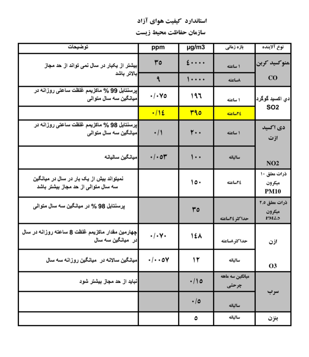 استاندارد کیفیت هوای آزاد سازمان محیط زیست، استاندارد آلودگی هوا